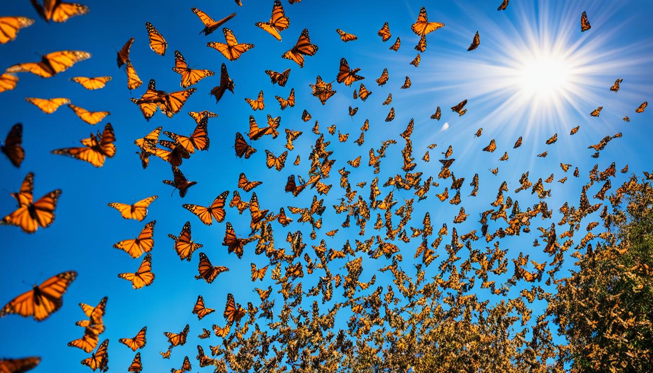 Also, try different angles and views to show off the monarchs’ bright colors and how they fly. With the right camera and an eye for details, you can capture the beauty of the monarch migration. You’ll get to see the intricate patterns on their wings and the amazing sight of many monarchs together.