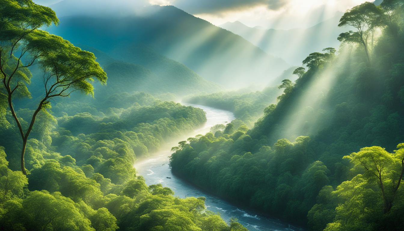 The Amazon Rainforest is called the “lungs of the Earth” because it’s key to the global climate. It’s a huge carbon sink, taking in and storing lots of carbon dioxide. This helps fight climate change. The Amazon’s plants and life forms are vital in this fight, protecting us from harmful greenhouse gases.